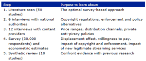 To answer these questions, the researchers focused on four types of creative content: (1) music, (2) audio-visual material, (3) books and (4) games. Their research approach relied on a review of the literature, interviews with national authorities and content providers, as well as a survey (p. 35).