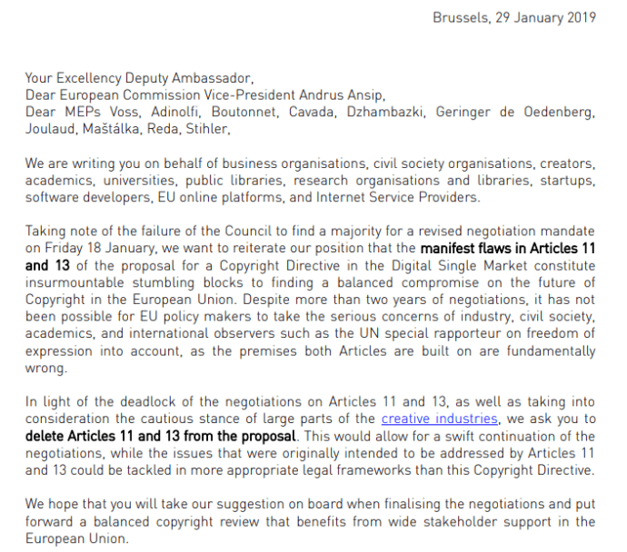 On 29 January 2019, over 85 organisations sent an open letter [PDF] on the EU copyright Directive in the Digital Single Market to the EU Member States’ Deputy Ambassadors, European Commission Vice-President for the Digital Single Market Andrus Ansip, and the Members of the European Parliament (MEPs) involved in the trilogue negotiations with the Council.