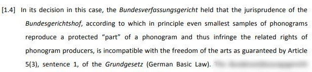 The German Federal Constitutional Court found that granting protection to even the smallest samples of a musical work was incompatible with the artistic freedom granted by the German Basic Law - see the European Copyright Society’s opinion [PDF] for more background. The German Federal Court of Justice, which needed to reassess the case, decided to ask a number of preliminary questions to the CJEU. It is as a result of these questions that AG Szpunar concluded in his Opinion that unauthorized sampling infringes the neighbouring rights of phonogram producers.